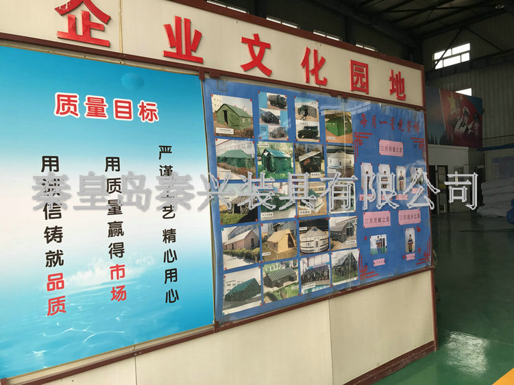 秦皇島秦興裝具有限公司有限公司源于我國(guó)第3524工廠,創(chuàng)建于2005年,占地面積30畝,是一家致力于研究,發(fā)展,制造和銷售為一體的綜合性裝具及紡織服裝加工生產(chǎn)企業(yè),我們的主要產(chǎn)品有單、棉帳篷,民用帳篷,旅游帳篷集各種機(jī)工產(chǎn)品等。